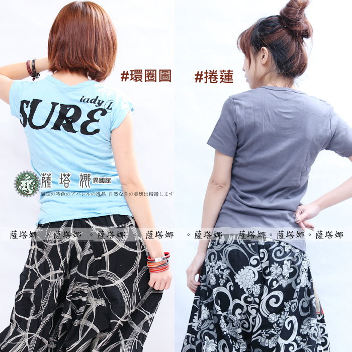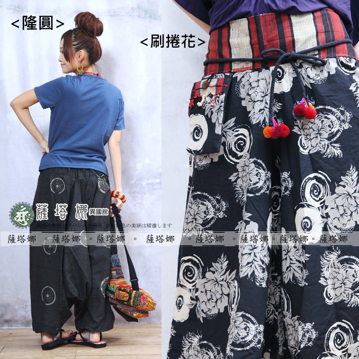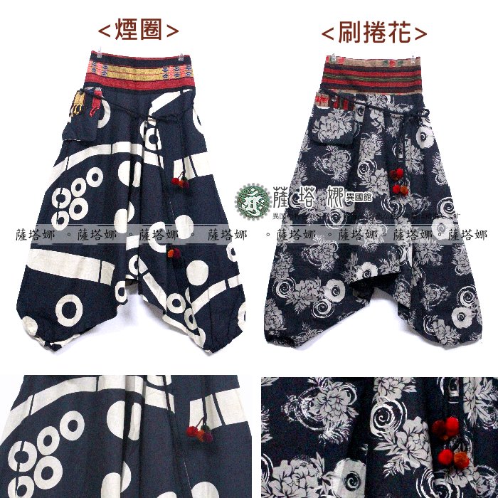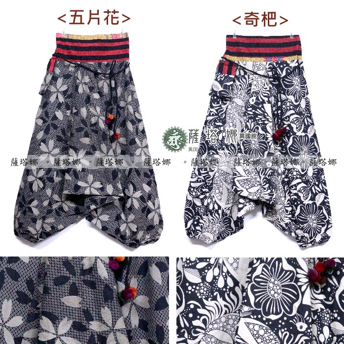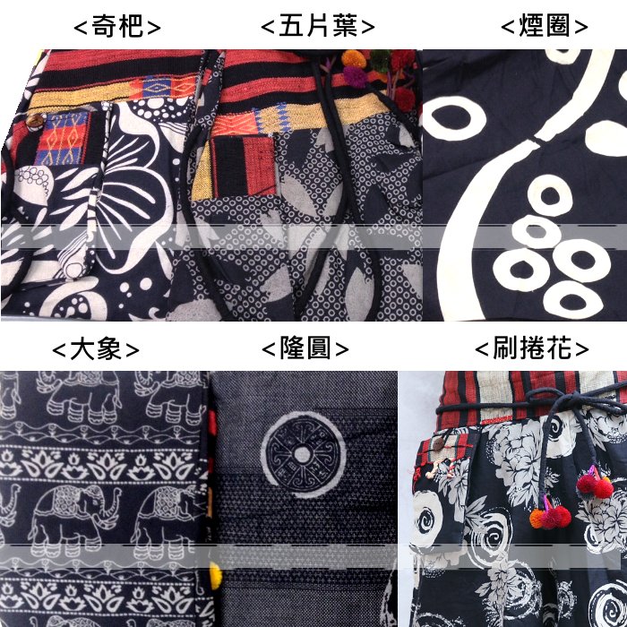 ★” = 限量款 = “★ 現貨花色請見標題_請先問!! (男模穿的經文 /大象/刷捲花/隆圓/煙圈/奇杷/五片葉停產!!) 數量不多~下單前請先詢問有沒有您要的花色喔!! 如遇缺貨會詢問是否【更換其他款式】 腰頭跟口袋用nagra布料~每款手織花樣稍不同_但大同小異採隨機出貨!! 有些口袋有綴流蘇_有些沒有喔!隨機出貨 清邁布料手工蓋印商品 此款腰圍設計: 正面平整腰際兩側各車上1條荔枝毛球腰帶+ 背後採鬆緊帶設計(無內裡!)~可修飾小腹 飛鼠褲型穿起來相當有造型