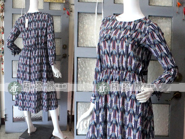 深藍底白紅劍形羽毛_縮腰燈籠袖洋裝 數量