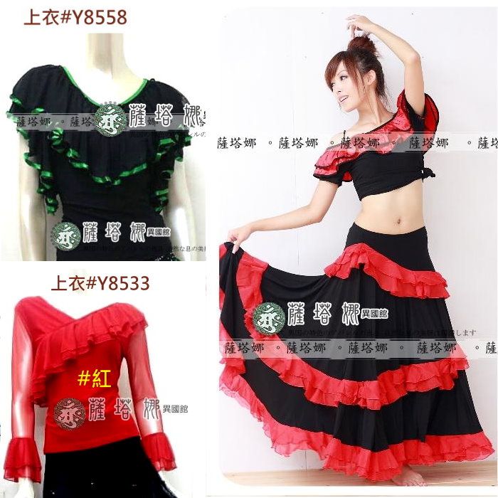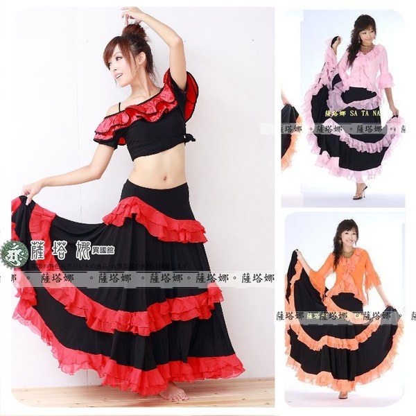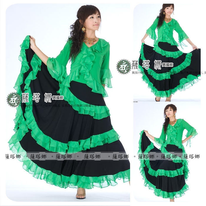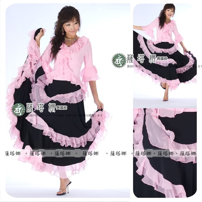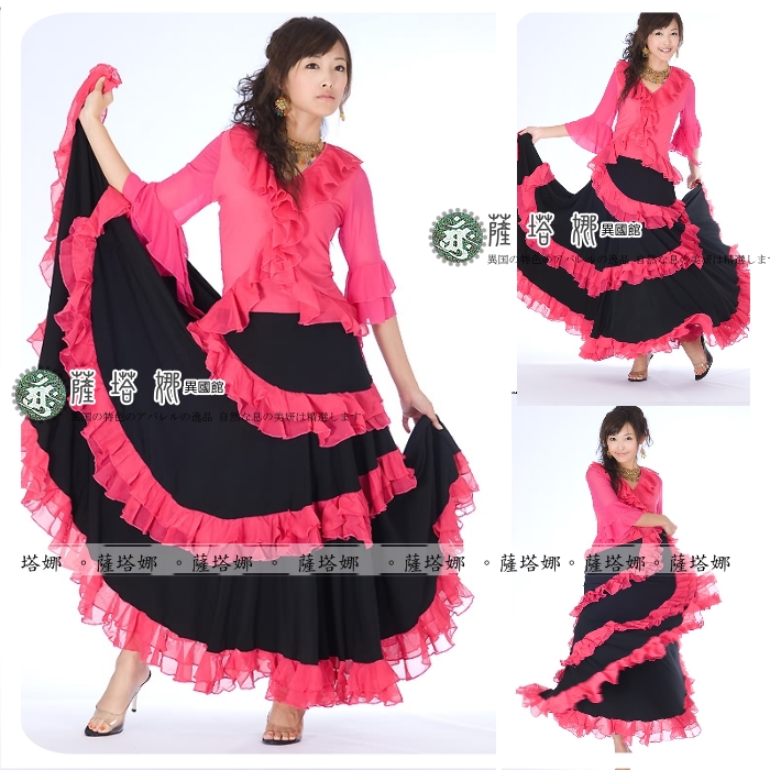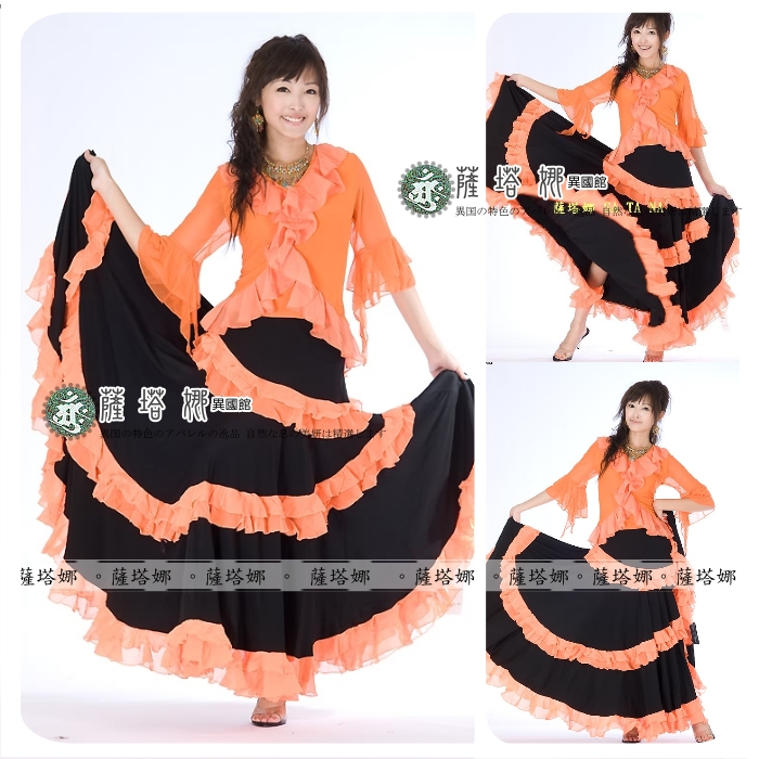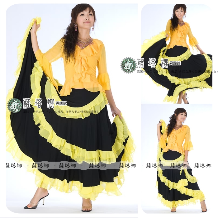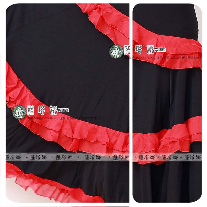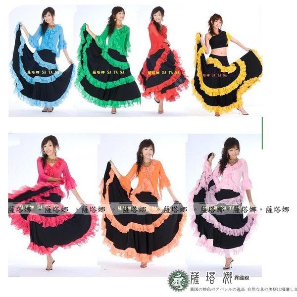 *~現貨+追加~* 顏色 : 黃 / 紅 / 綠 / 粉 / 橘 / 桃 /水藍 ( 粉色缺貨 ) 水晶麻料+雪紡紗滾邊 ~此款布料有垂墬性(重量會將寬度往下墬), 這邊為您吊起(未拉開)開始寬(由腰上往下約25cm處開始寬)至最寬處(裙下襬未拉開)約76cm 此款甩開有180度 桃色在搭配部分款式衣服上面會有色差再加材質布料上不同很容易才有落差請注意~ 如有不確請先詢問 因為佛朗明哥裙很容易因為客人試穿~然後又會去試甩裙擺看效果 導致容易指甲鉤傷布面而卻無法再2次販售!!