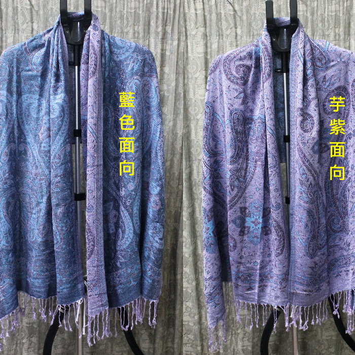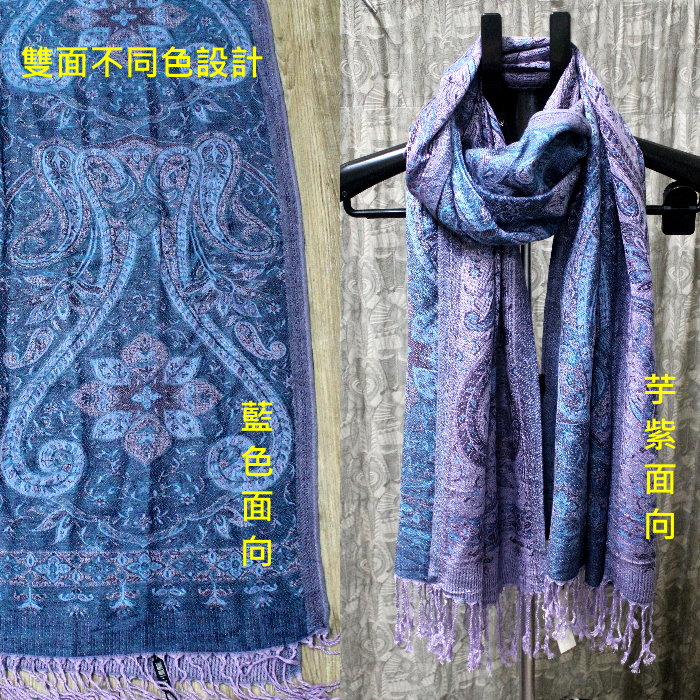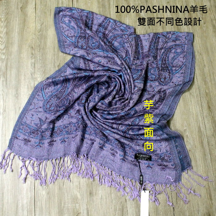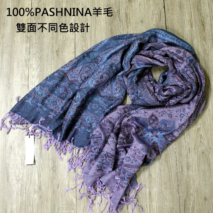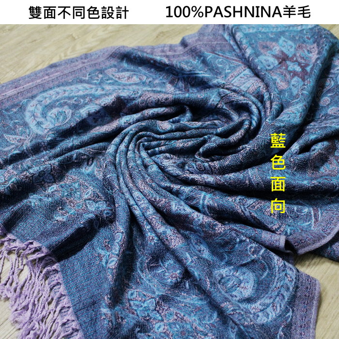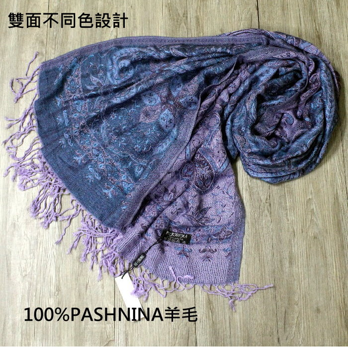 請先問_觸感柔軟親膚有光澤_100%PASHNINA羊毛_雙面藍芋頭紫草履_羊毛流蘇圍巾 數量